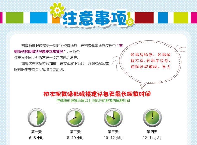 《佩戴隐形眼镜常识》 1、摘戴之前一定要把大拇指和食指的指甲剪平、再把双手洗干净摘戴 2、摘戴要先右后左,养成先右后左的习惯不会使两眼度数混淆 3、戴上隐形眼镜时不要接近高温与明火处以免隐形眼镜融化 4、睡觉之前一定把隐形眼镜摘下,不能戴着隐形眼镜睡觉,那样会使眼睛缺氧,导致眼睛充血与角膜发炎 5、平常戴隐形眼镜都很舒适、偶尔戴上隐形眼镜感觉到不舒适、请及时取下隐形眼镜,到购买处去检查到底是什么原因发生,处理好在进行佩戴隐形眼睛。