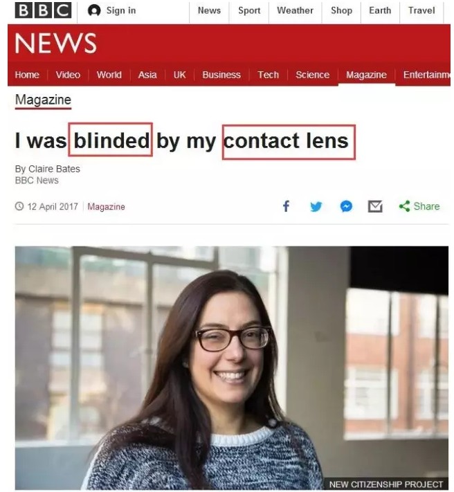 隐形眼镜, 对于很多妹子来说都是居家必备品 平常出门吃个饭,逛个街 不想戴眼镜的时候,就直接戴上隐形 不仅方便,而且还有很多颜色可选 实在是变美的利器! 不过,隐形眼镜虽好 但你可知道,一个不经历的小动作 就能让它变成最可怕的杀手, 夺走你的光明! 这不是危言耸听, 最近一个国外妹子就声泪俱下地控诉—— "隐形眼镜千万不要沾水! 不然到最后瞎的是你!" 根据英国广播电视台BBC本周三的报道,一名叫 Irenie Ekkeshis 的妹纸, 就因为隐形眼镜沾到了水, 而付出了永远失去右眼视力的重大代价! (图片:新闻报道 来源:BBC) 事情是这样的。Irenie 从很小的时候就近视了,在医生的建议下,她戴上了厚厚的眼镜。 这幅眼镜虽然让Irenie看得更清楚了,却也给她生活带来了不便。12岁那年,她第一次接触到隐形眼镜,快捷和美观的隐形眼镜,一下子抓住了她的心。 从那以后,她就丢掉了框架眼镜,转投了隐形眼镜的怀抱,这一戴,就是18年! 这18年里,她几乎尝试了市面上所有的隐形眼镜,对各个注意事项也都烂熟于心,也从来没有感到任何不适。